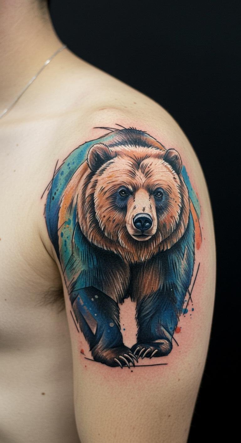 The vibrant watercolor bear tattoo on the upper back symbolizes strength and emotional depth, embodying a wild heart that thrives with resilience.