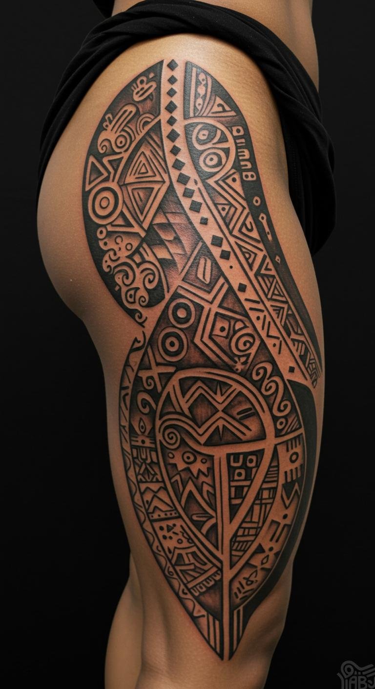 African Thigh Tattoo With Storytelling Symbols