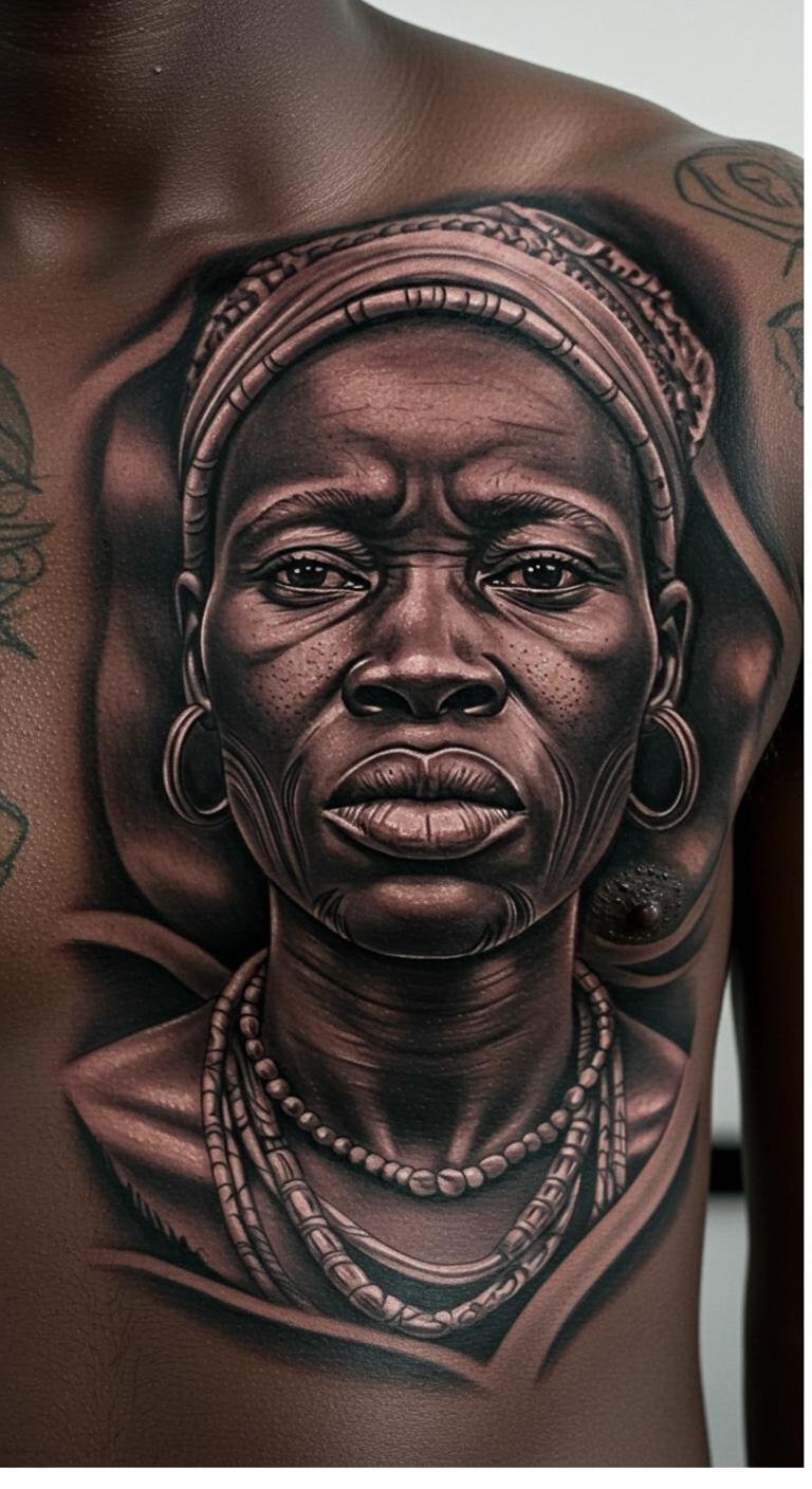 African Chest Tattoo With Ancestral Portrait