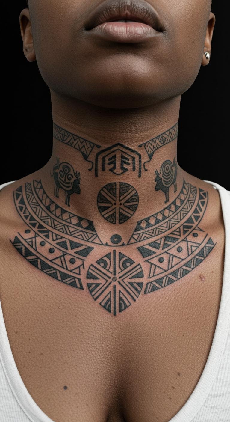 African Neck Tattoo With Cultural Emblems