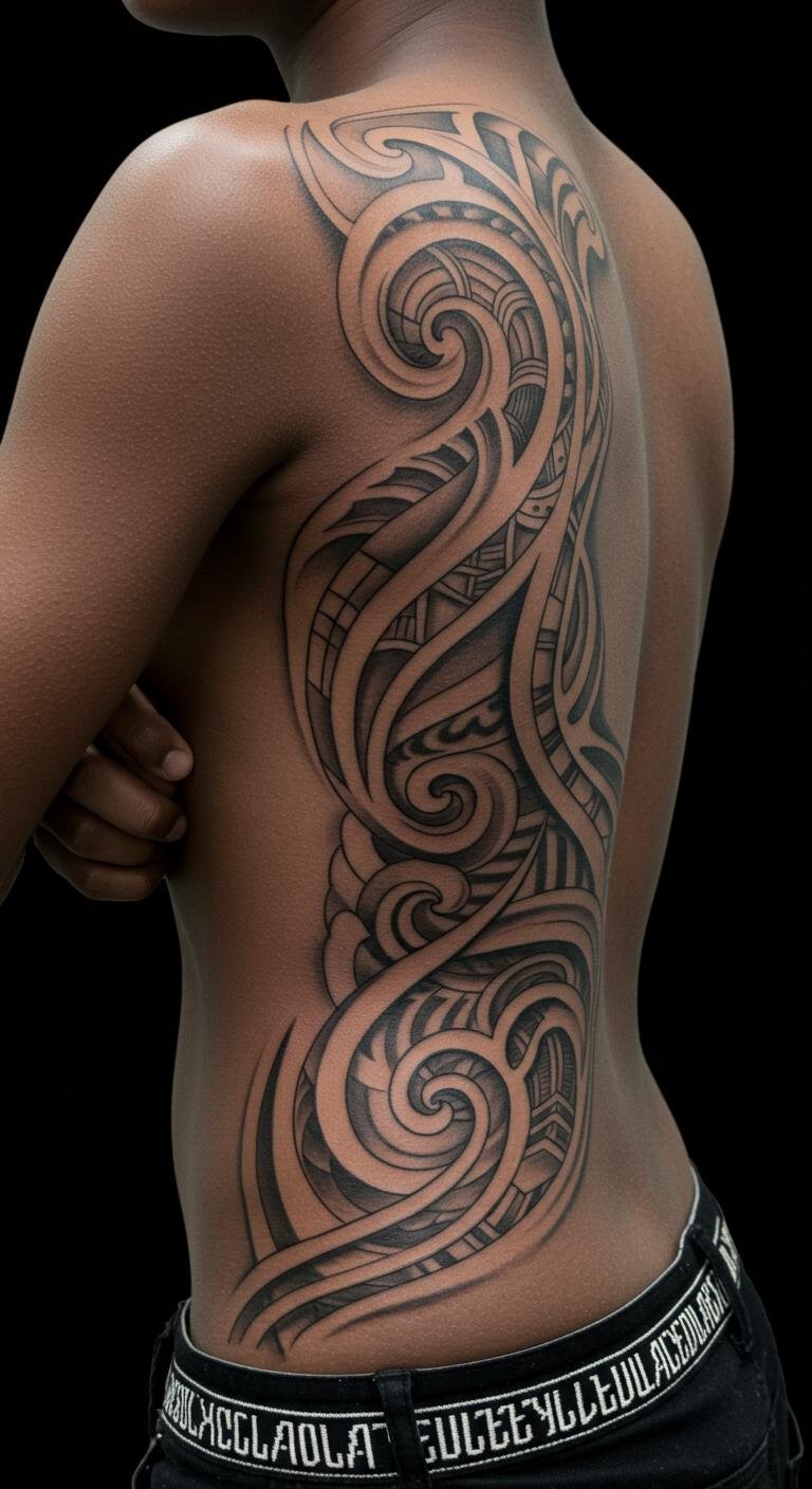 African Back Tattoo With Elegant Swirl Motifs