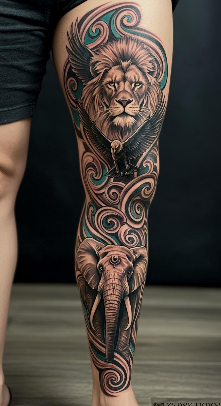 African Leg Sleeve Tattoo With Mythical Creatures