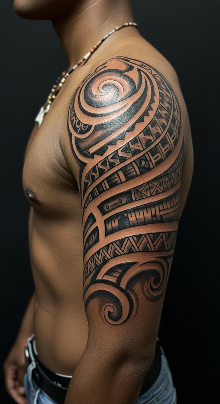 Positioned on the shoulder, it acts as both art and armor, empowering the wearer while celebrating their roots and individuality, making it a profound statement on the canvas of the skin.