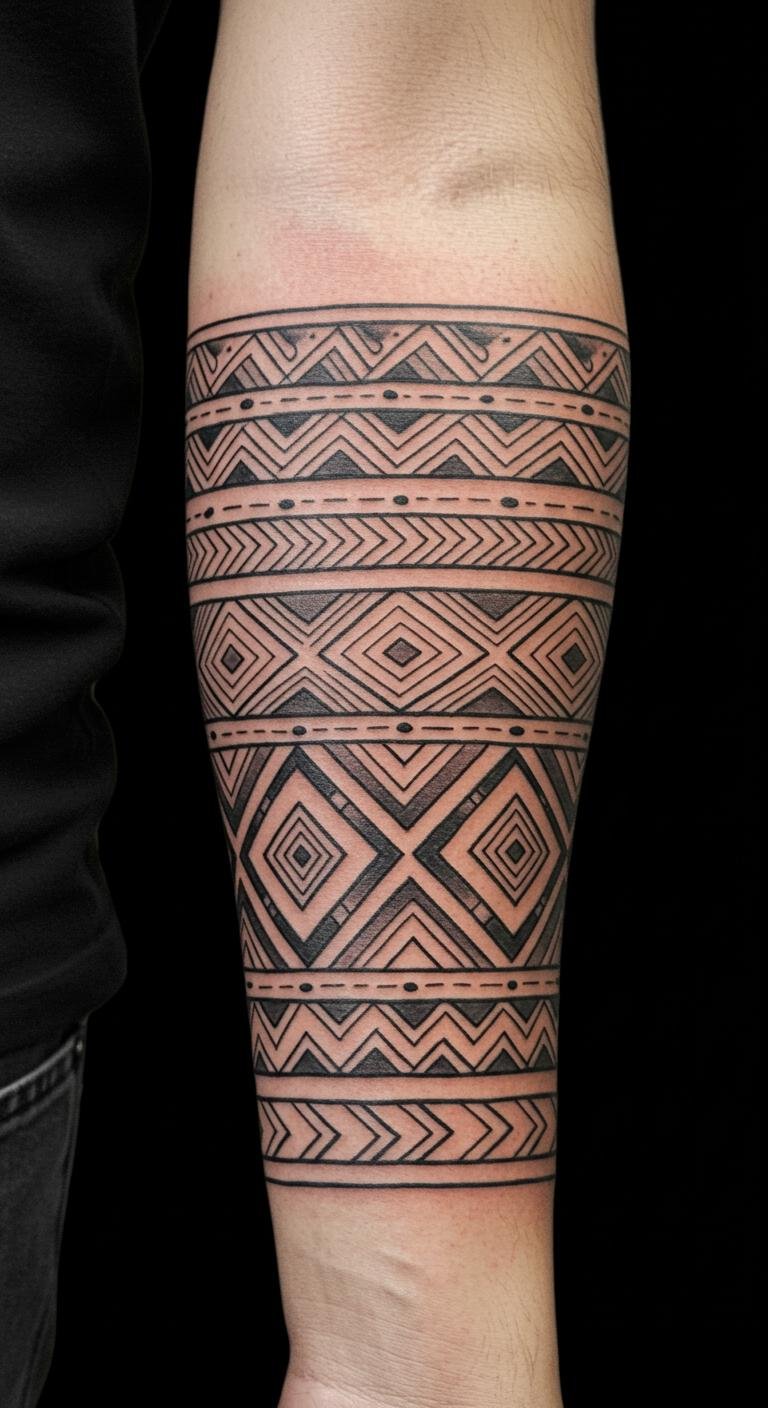 This tattoo symbolizes a deep connection to tribal roots and personal identity, with each geometric shape representing strength, unity, and cultural significance. The placement on the forearm allows for visibility, serving as a daily reminder of one’s heritage, while also functioning as a conversation starter about the rich stories these designs convey. The warm lighting enhances the natural skin tone, making the tattoo appear as a part of the wearer’s identity, embodying both tradition and modern artistry.