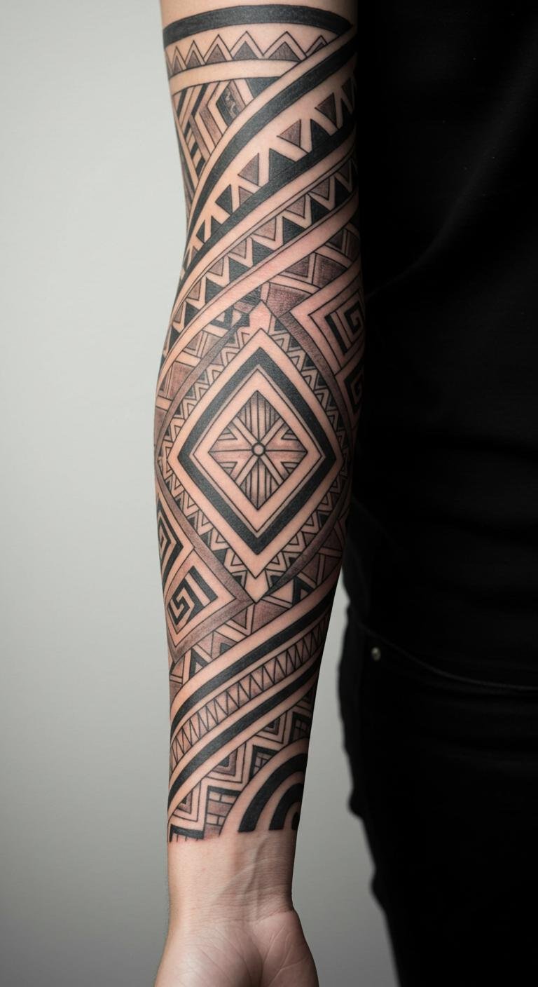The bold geometric patterns create a dynamic visual narrative that resonates deeply with cultural identity. Positioned on the forearm, this tattoo serves as a constant reminder of the wearer’s roots and values, making it not only a striking piece of art but also a powerful emblem of pride and endurance.