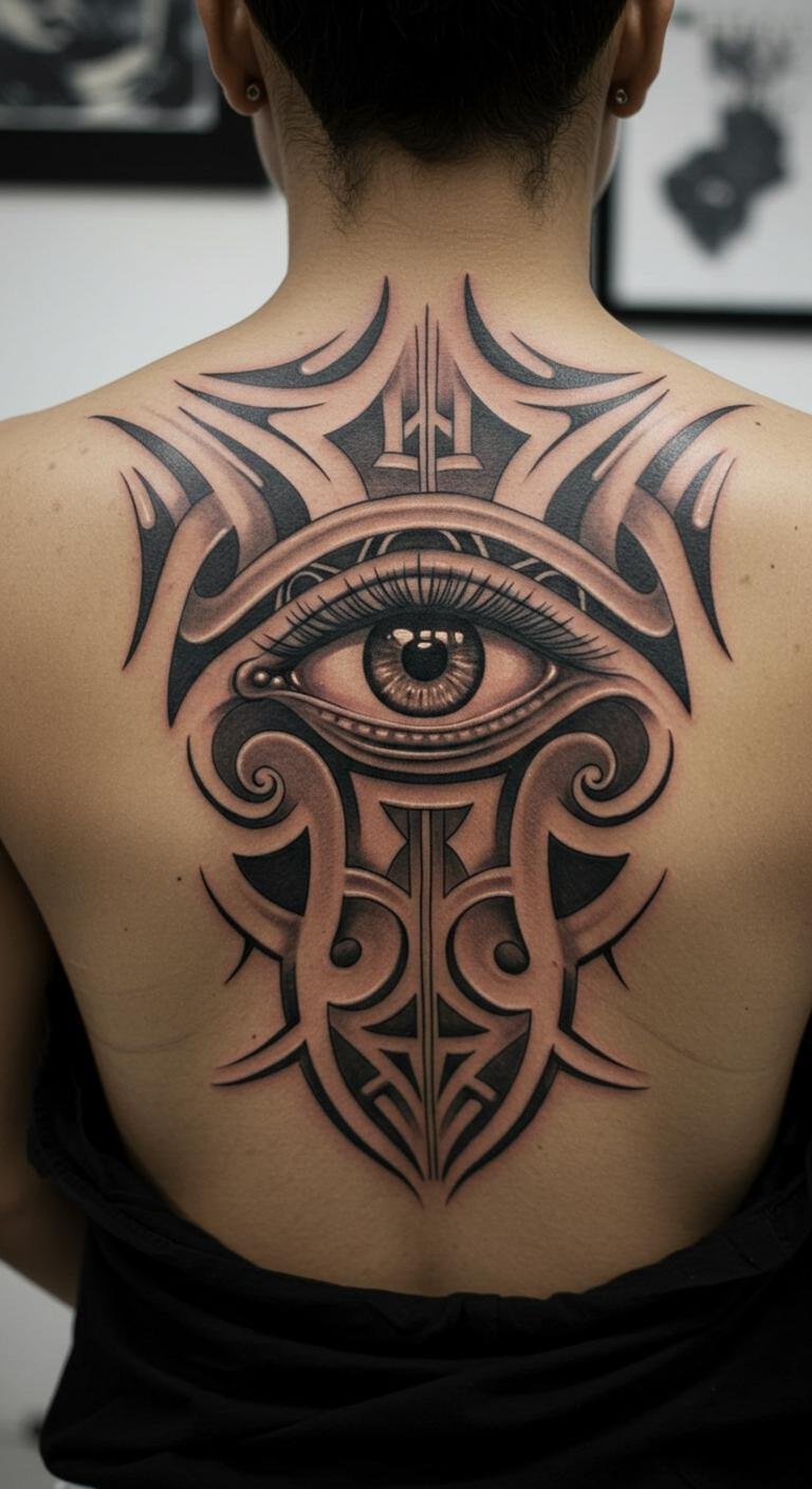 African Full Back Tattoo With Protective Eye Motif