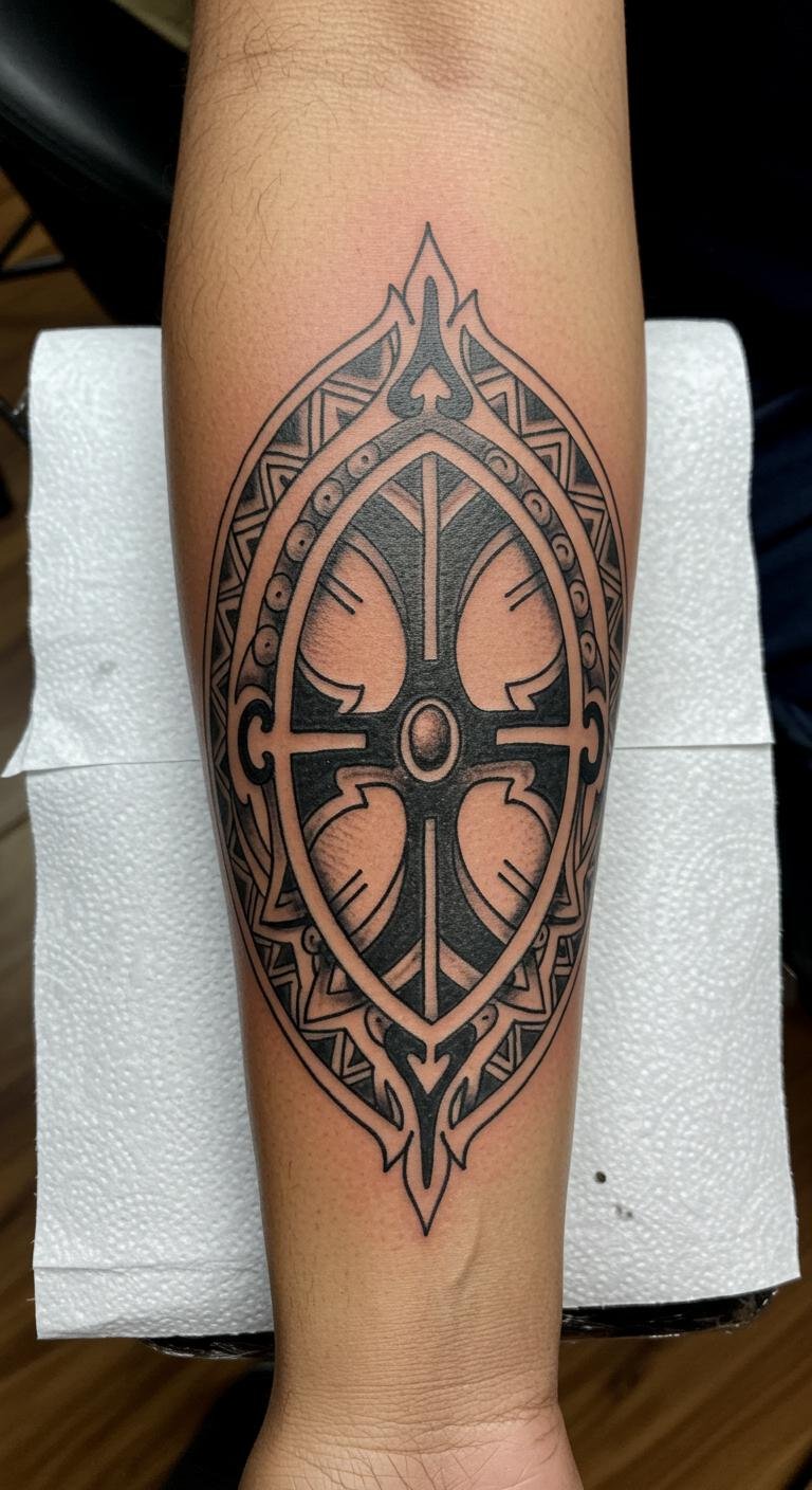 This tattoo symbolizes strength and resilience, embodying the protective qualities of a shield while honoring the rich tapestry of African cultural narratives.