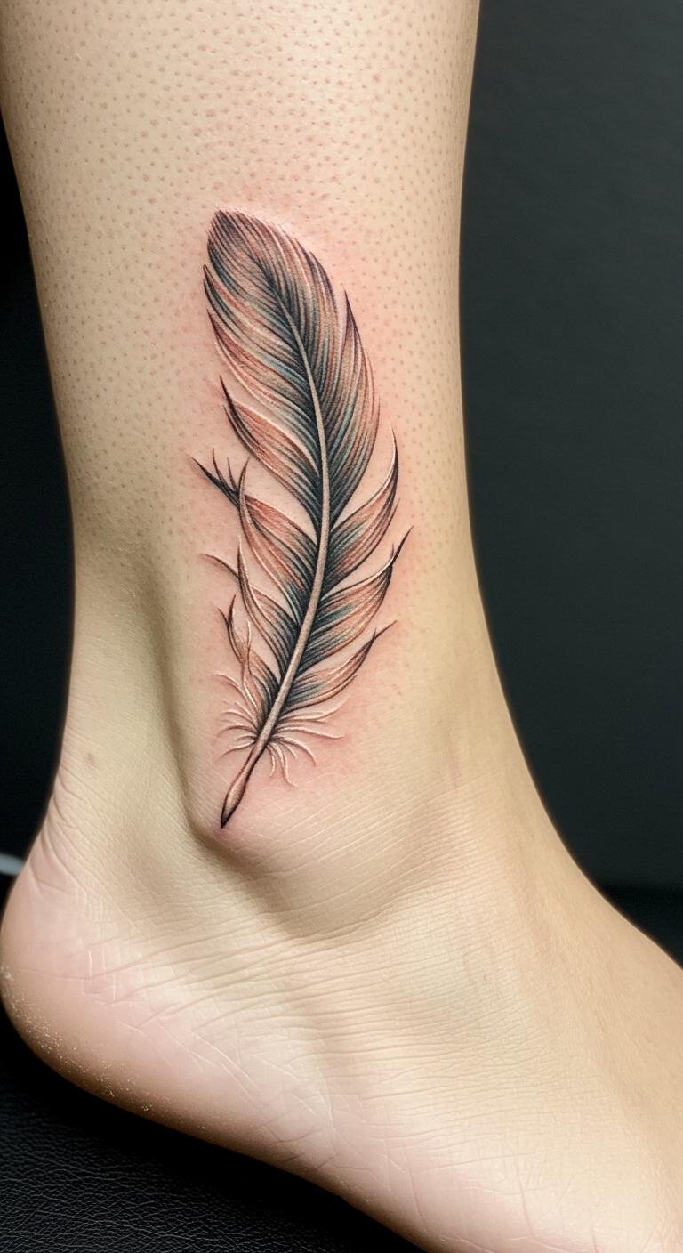 This exquisite feather ankle tattoo symbolizes freedom and lightness, embodying grace in its design. The placement on the ankle allows for subtle visibility, making it an elegant expression of individuality.