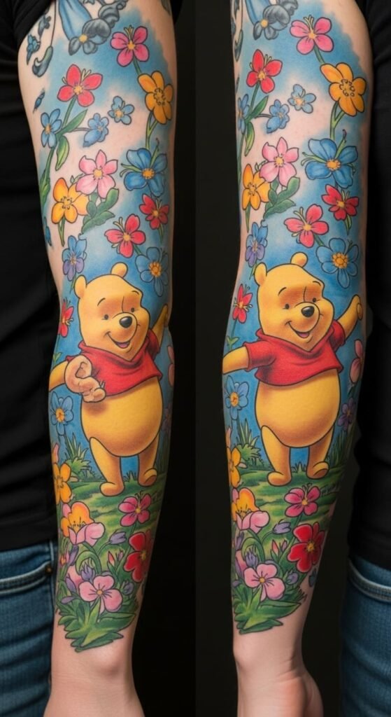 Winnie the Pooh Colorful Garden Sleeve Tattoo