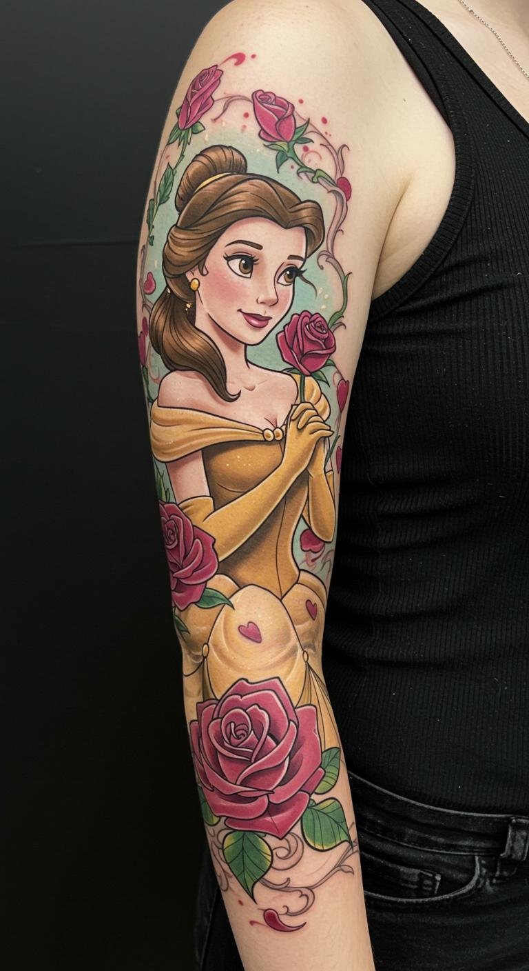 This tattoo symbolizes love and transformation, illustrating Belle’s journey and the enchanting power of the roses that bloom alongside her.