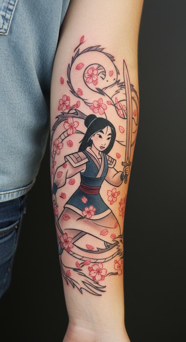 This tattoo beautifully symbolizes courage and honor, reflecting the spirit of Mulan as she embodies resilience against adversity.
