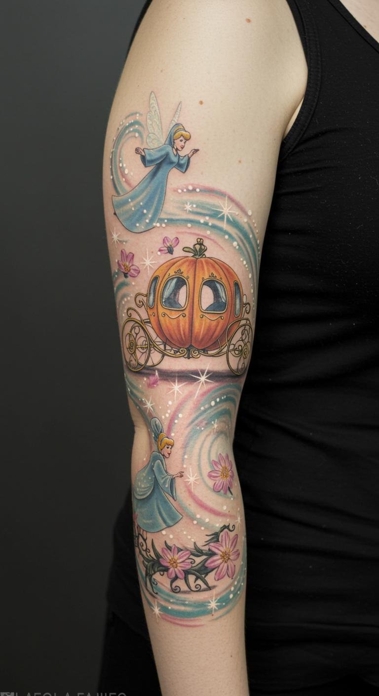 This tattoo captures the essence of transformation and magic, symbolizing freedom and adventure through Cinderella’s iconic journey.