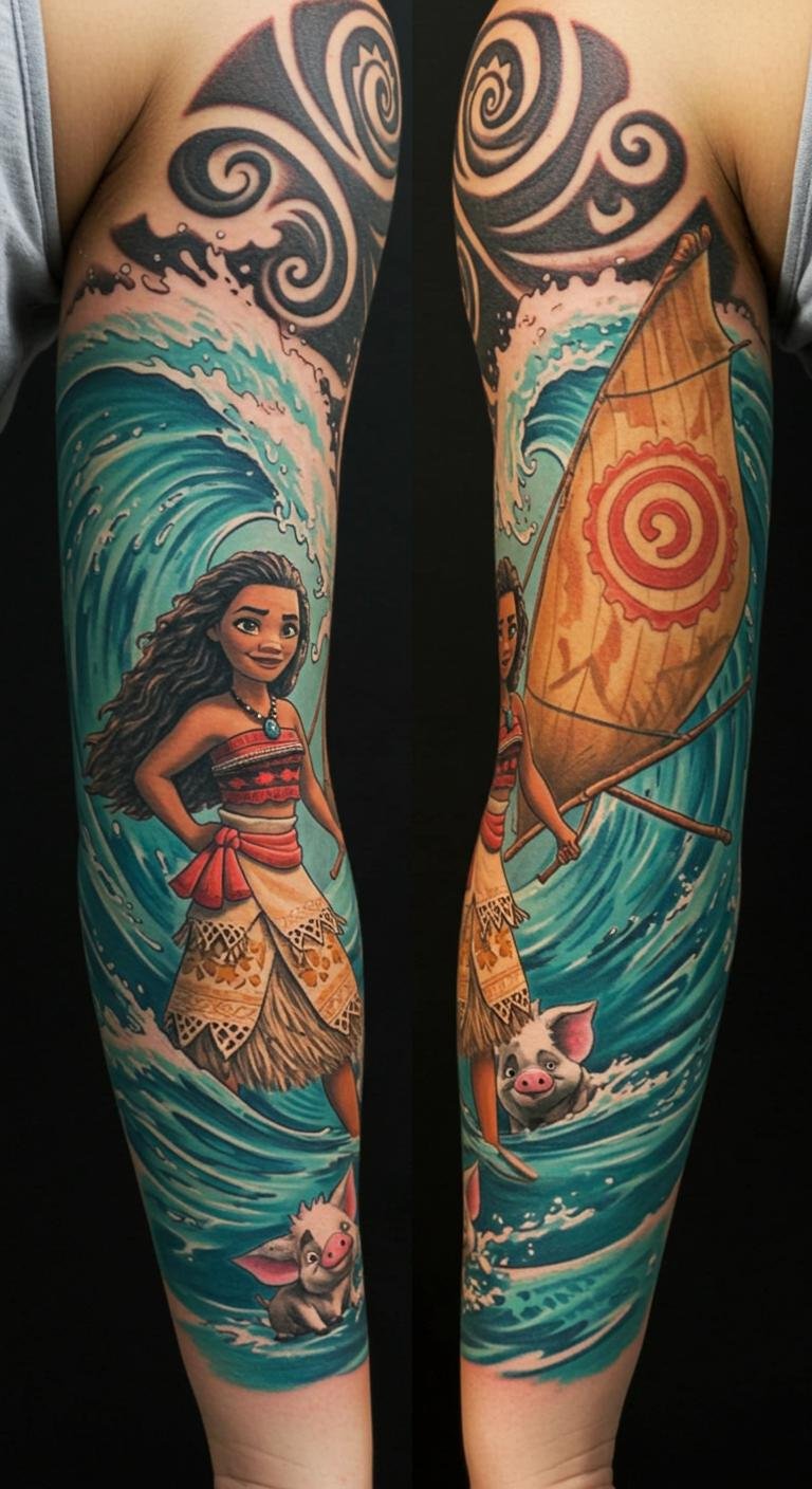 This Moana Ocean Journey Sleeve Tattoo symbolizes the spirit of adventure and self-discovery, inviting wearers to embrace their own journeys.