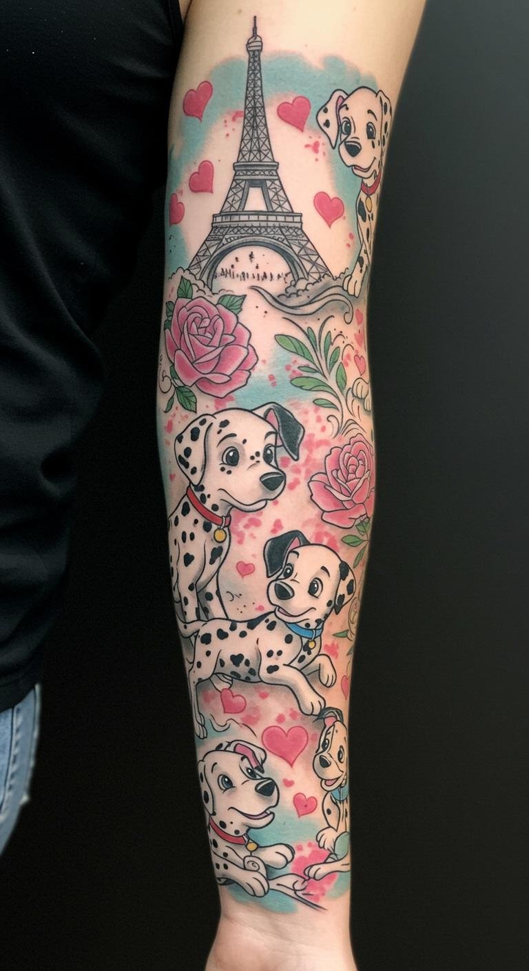 Dalmatians Floral and Parisian Sleeve Tattoo
