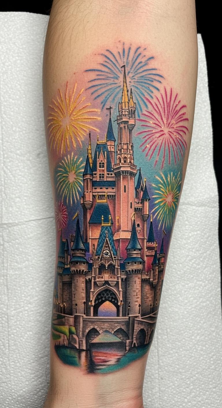 Magical Disney Castle Fireworks Sleeve Tattoo