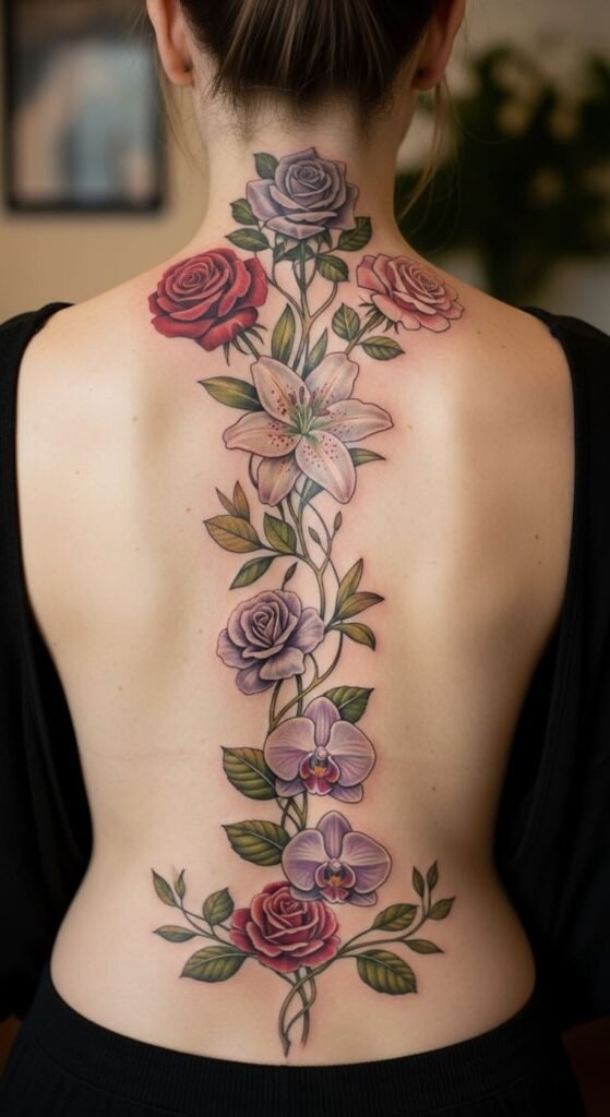 This floral spine tattoo symbolizes strength and elegance, embodying the essence of femininity and freedom.