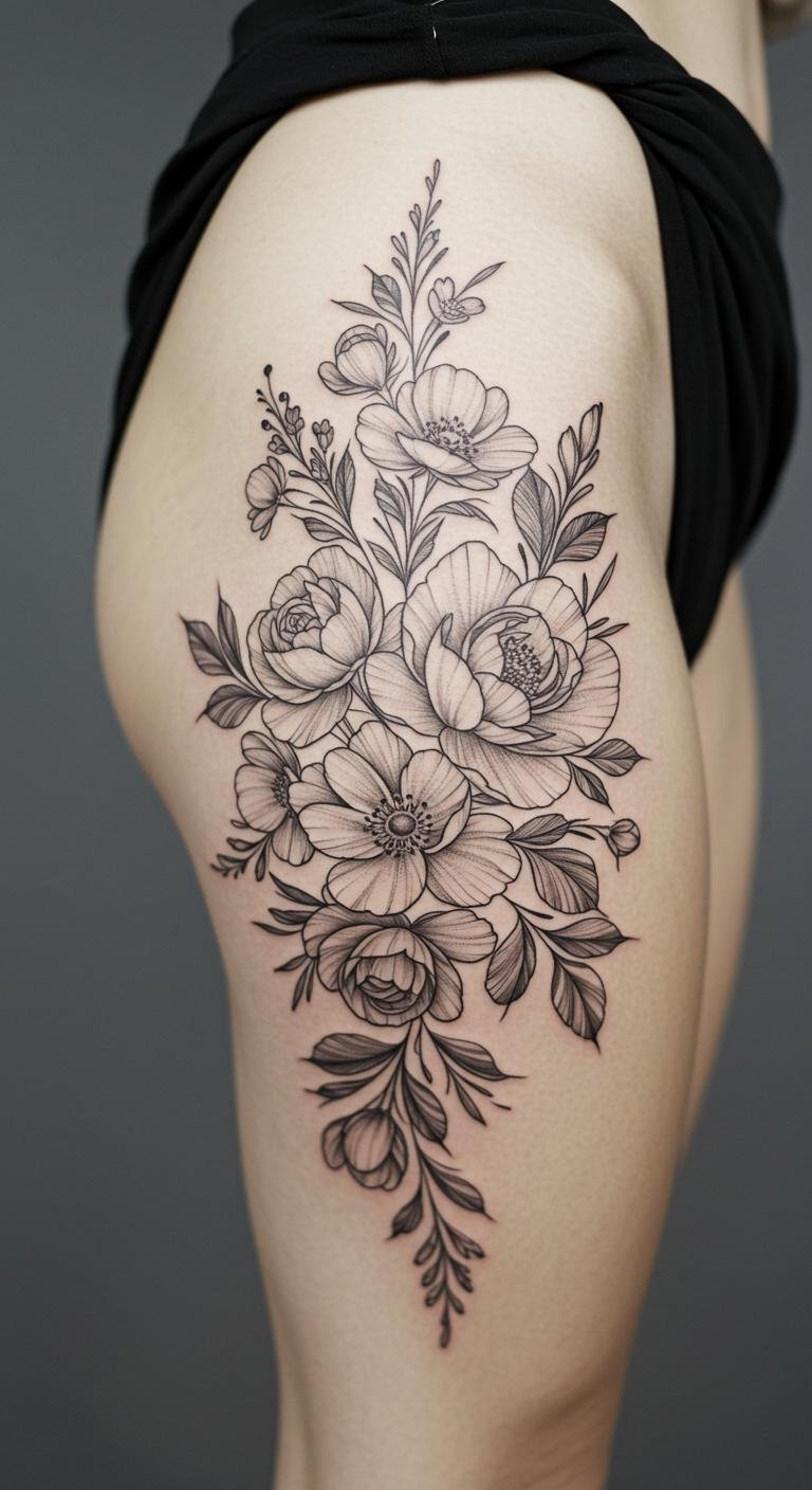 This tattoo embodies the essence of growth and freedom through its delicate floral motifs. Each bloom symbolizes resilience and beauty, celebrating individuality and grace while enhancing the natural curves of the upper thigh.