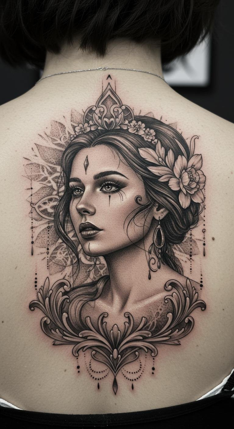 This tattoo represents the strength and beauty inherent in womanhood, with each element symbolizing different aspects of femininity.