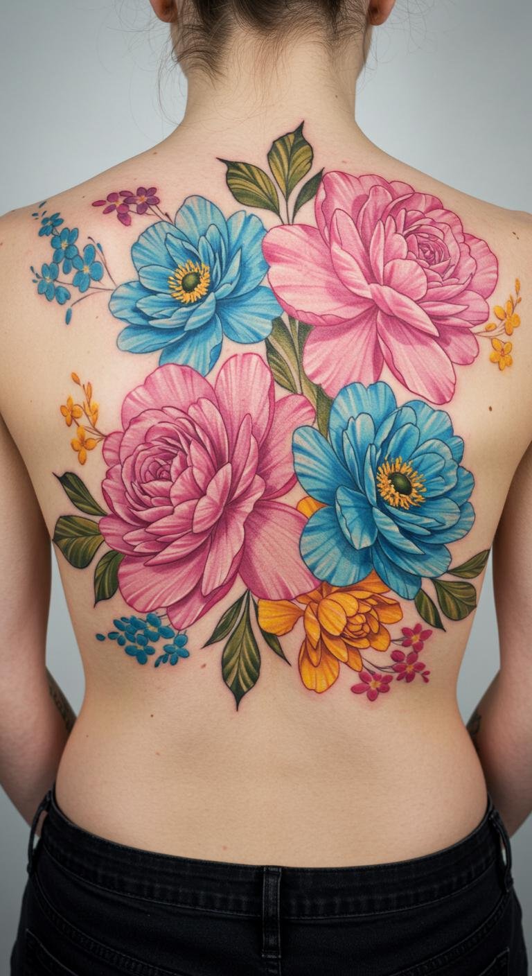 Vibrant Floral Back Tattoo