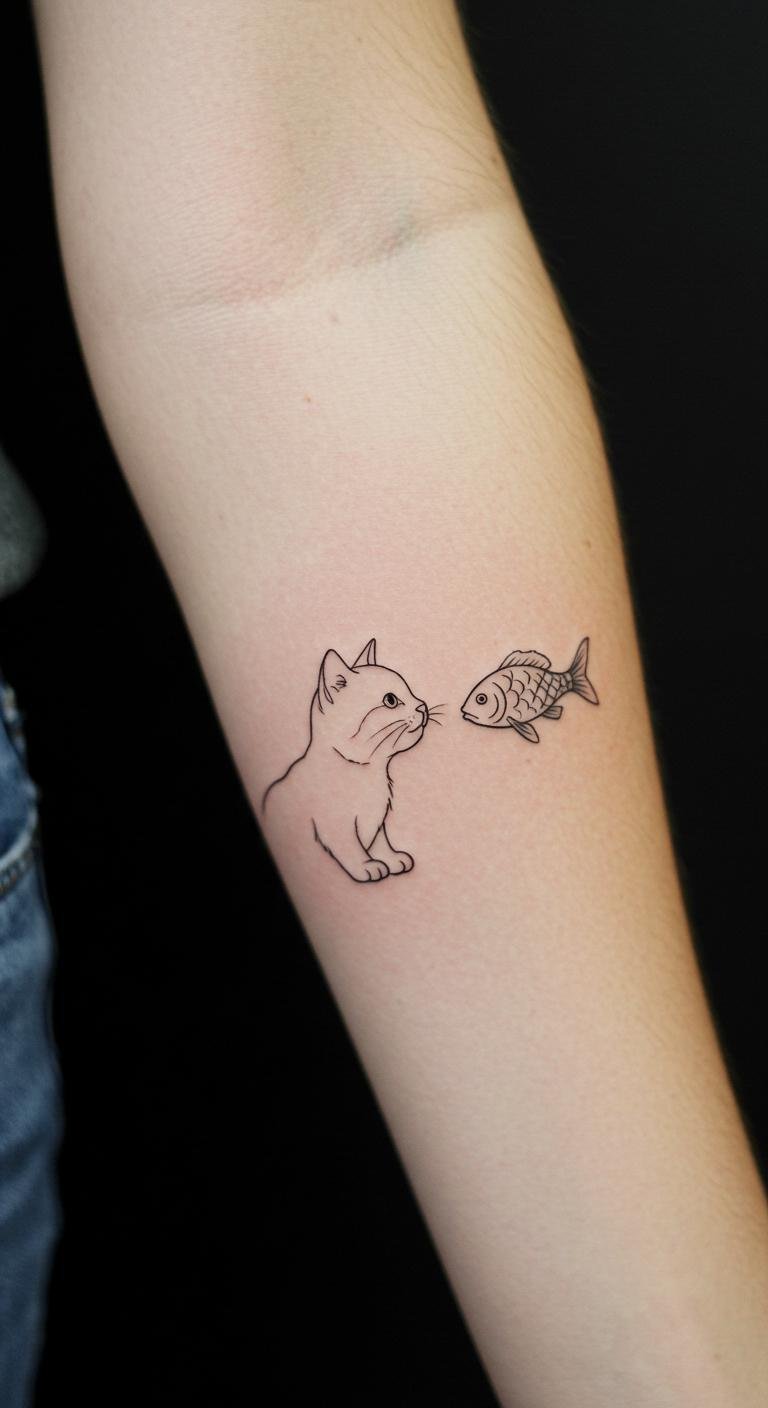 Cat and Fish Fine Line Tattoo