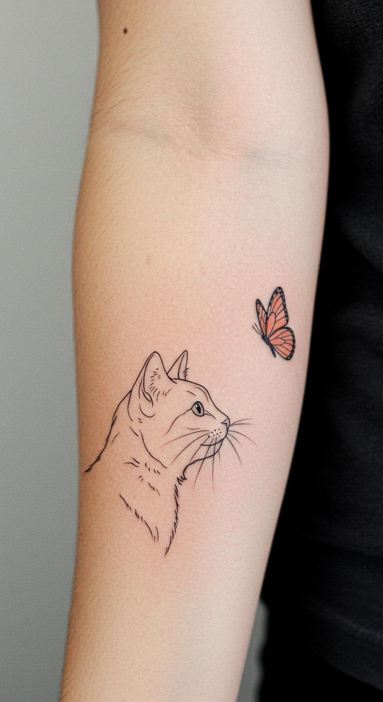 Cat With Butterfly Fine Line Tattoo