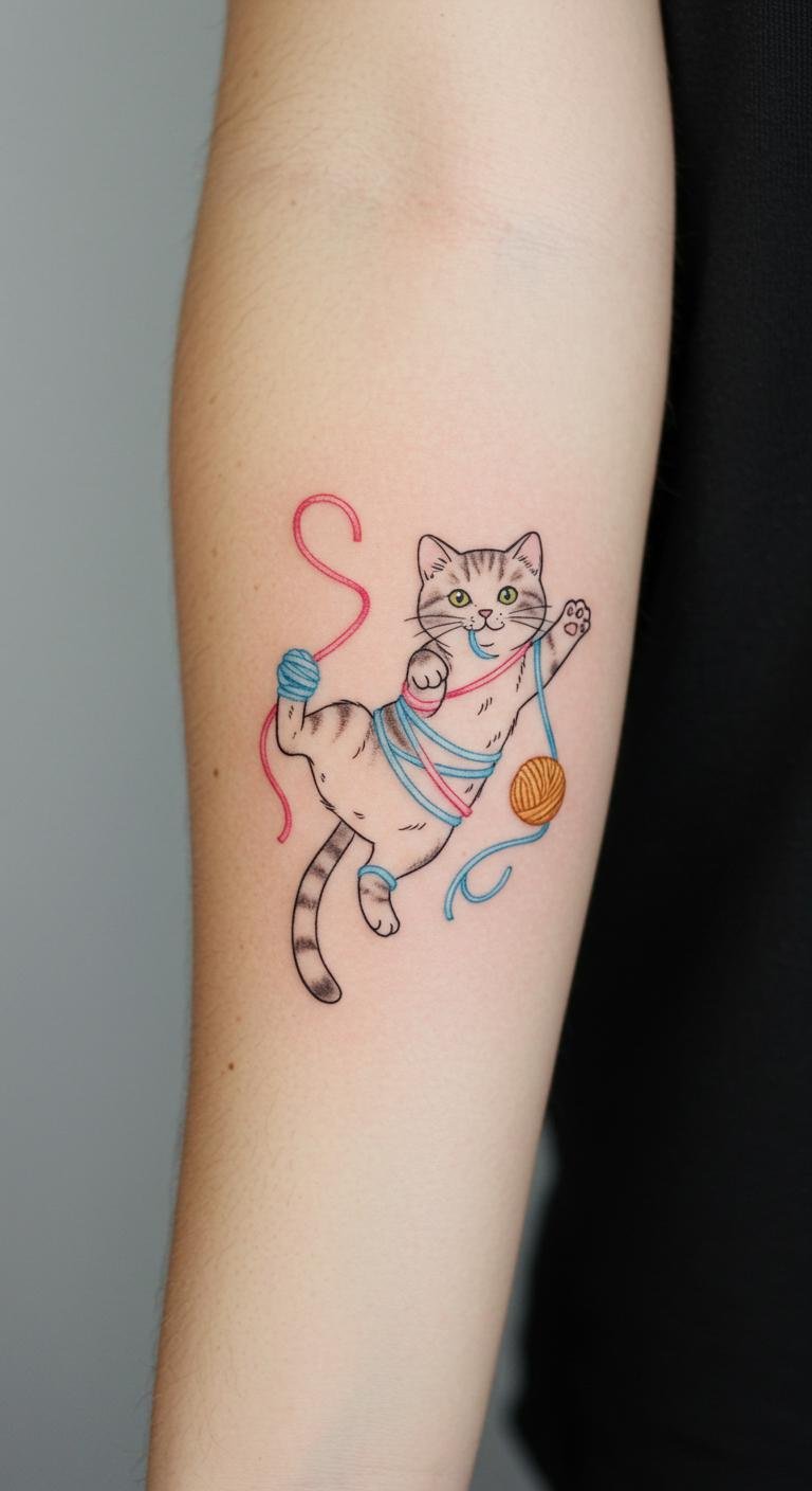 This charming tattoo design embodies the spirit of playfulness and curiosity often found in cats.