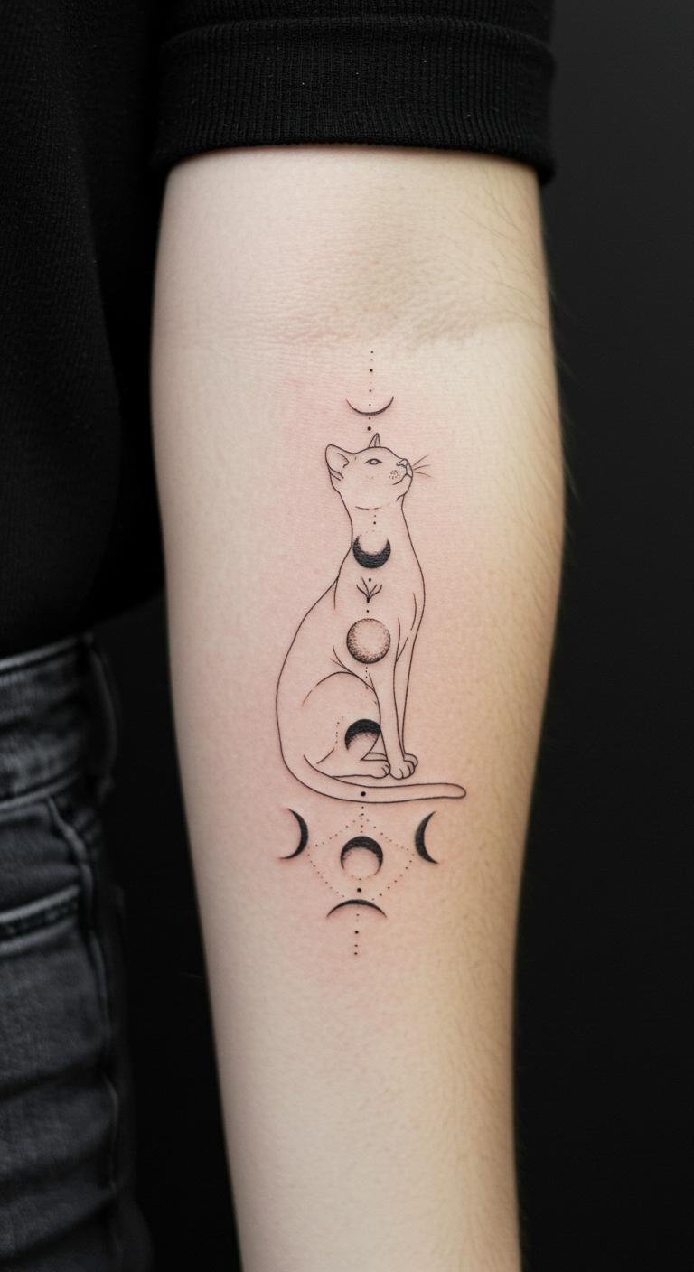 Placed on the forearm, it offers a visible reminder of one’s love for celestial beauty and feline companionship, serving as a constant source of inspiration and freedom.
