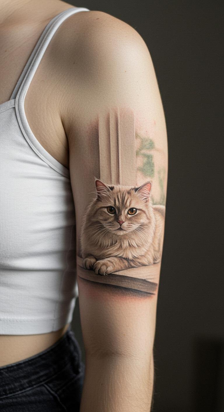 Window Cat Fine Line Upper Arm Tattoo
