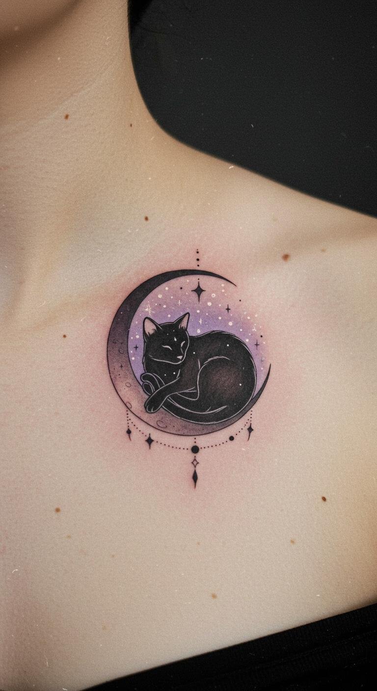 This Cosmic Cat and Crescent Moon tattoo embodies a deep connection to the universe, symbolizing intuition, mystery, and a sense of wonder.
