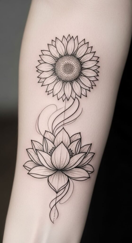 This tattoo symbolizes the duality of life, with the sunflower representing joy and positivity, while the lotus signifies rebirth and spiritual awakening.