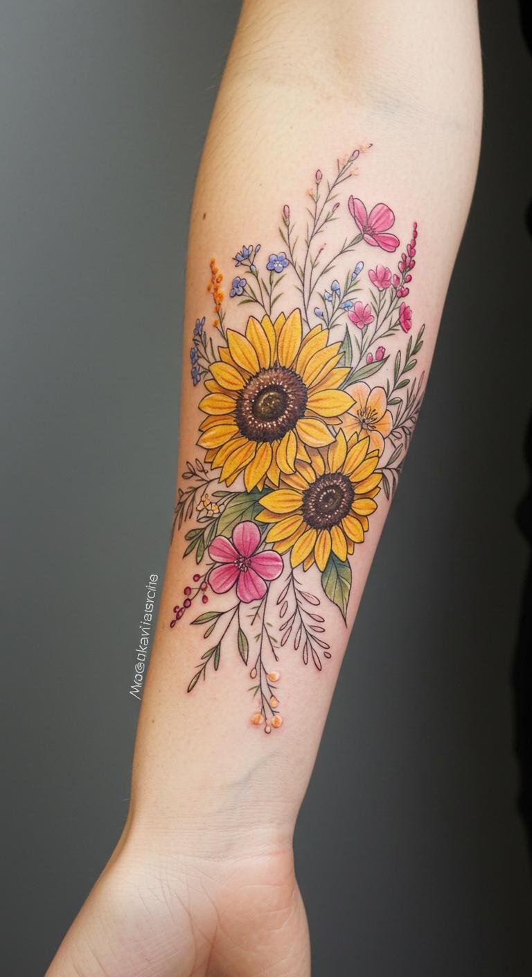 This tattoo embodies the essence of nature and individuality, with sunflowers symbolizing warmth and positivity and wildflowers representing freedom and resilience.