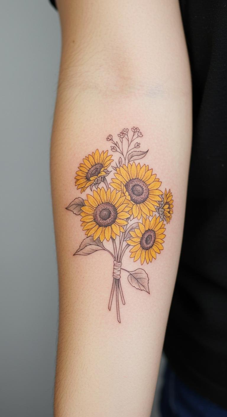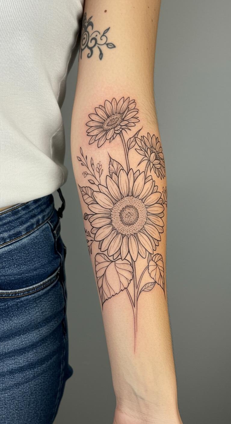Fine Line Sunflower Bouquet Tattoo