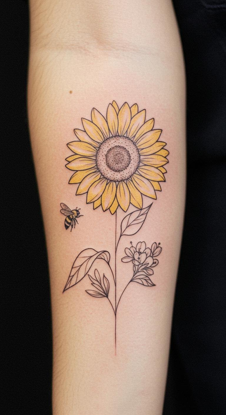 This tattoo embodies the harmony found in nature, with the sunflower representing warmth and positivity, while the bee symbolizes hard work and the critical role of pollinators in our ecosystem.