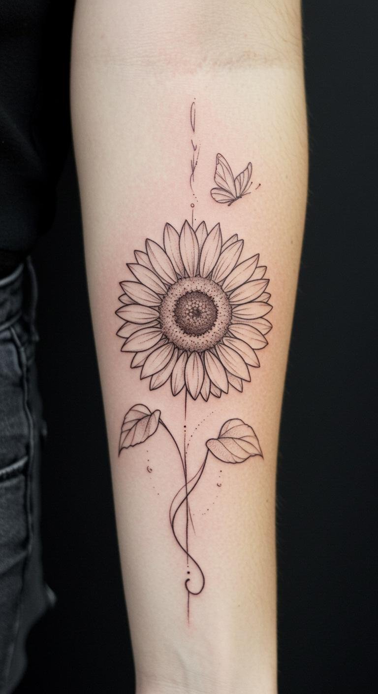 Fine Line Sunflower and Butterfly Tattoo