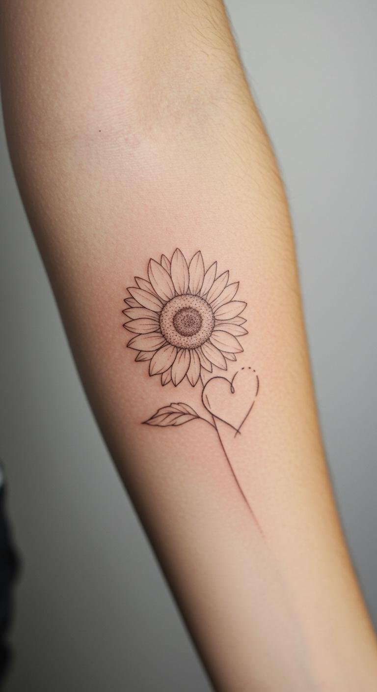 This tattoo symbolizes the deep connection between love and nature, with the fine line sunflower representing adoration and loyalty while the heart conveys profound affection.