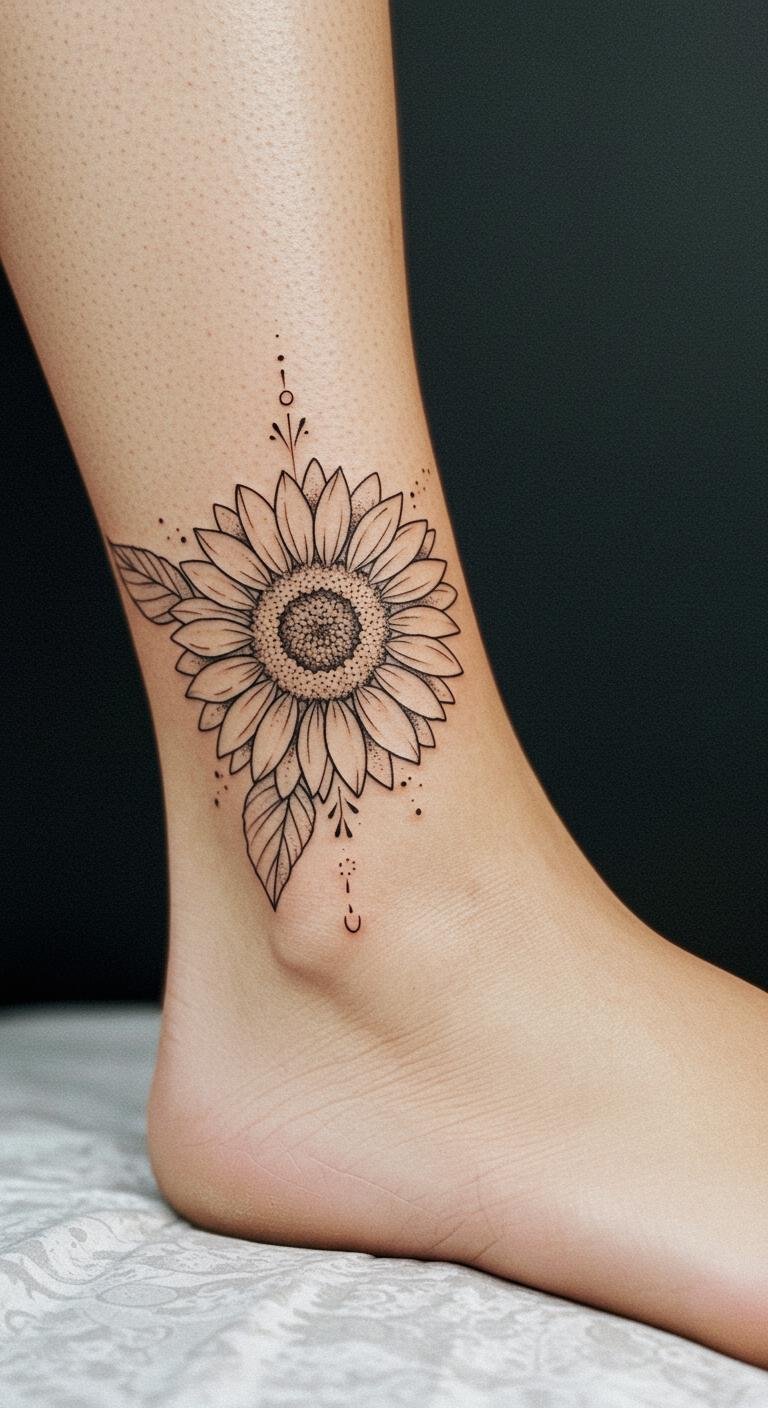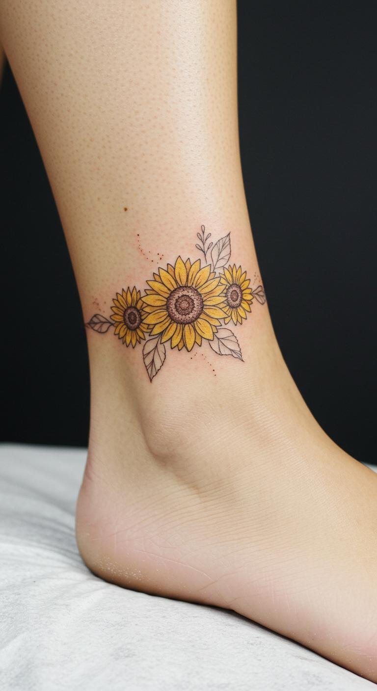 This sunflower anklet tattoo symbolizes freedom and the beauty of nature, evoking feelings of joy and nostalgia reminiscent of carefree summers.