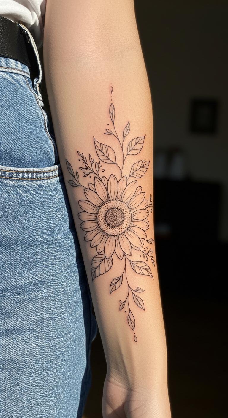 This sunflower tattoo symbolizes joy, creativity, and the beauty of blooming in life.