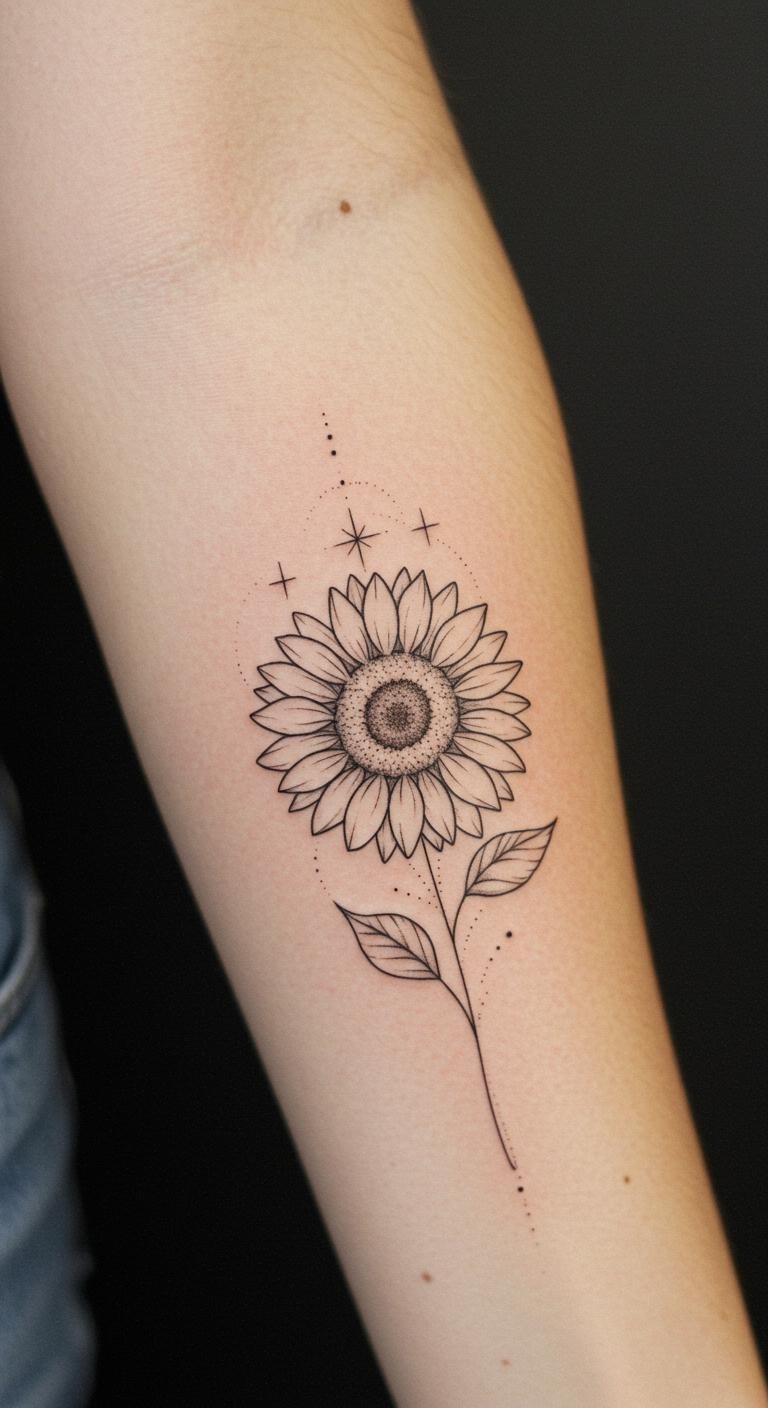 Fine Line Sunflower and Star Tattoo