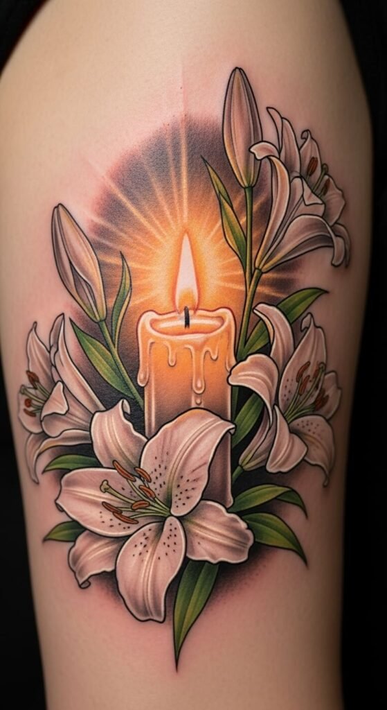 The candle represents hope and guidance, while the lilies embody purity and renewal, making this tattoo a poignant expression of faith.