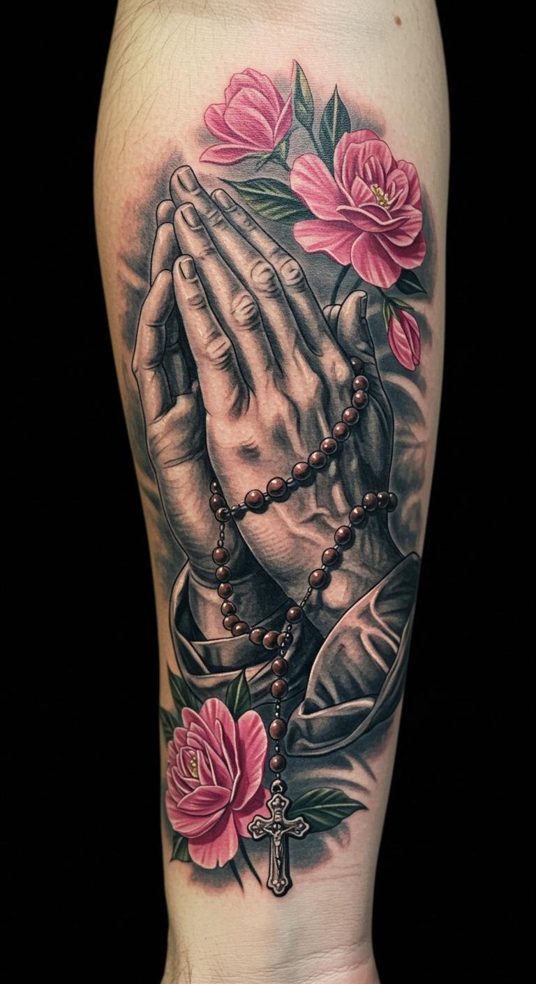 The praying hands represent a connection to the divine, while the rosary signifies prayer and protection. The blooming flowers add layers of meaning, symbolizing new beginnings and the beauty of life.