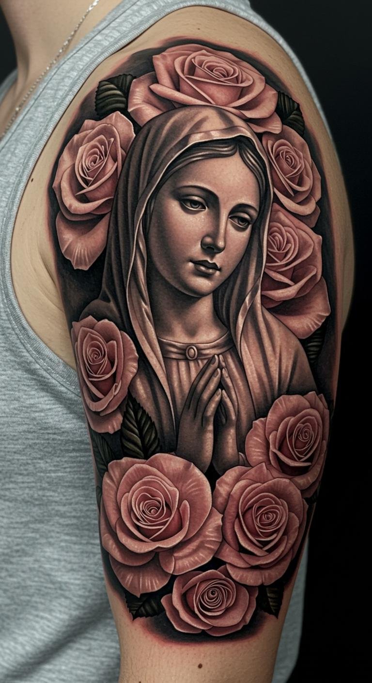 This tattoo design serves as a powerful symbol of grace and maternal love, embodying the sacred beauty and devotion represented by both the Virgin Mary and the roses.