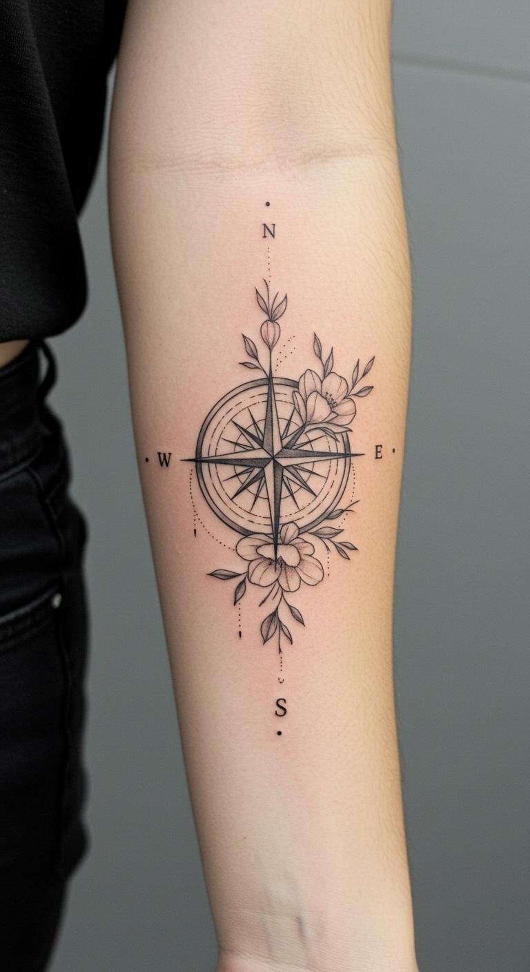 This compass tattoo embodies the journey of self-discovery and direction, symbolizing the importance of finding one’s path in life.
