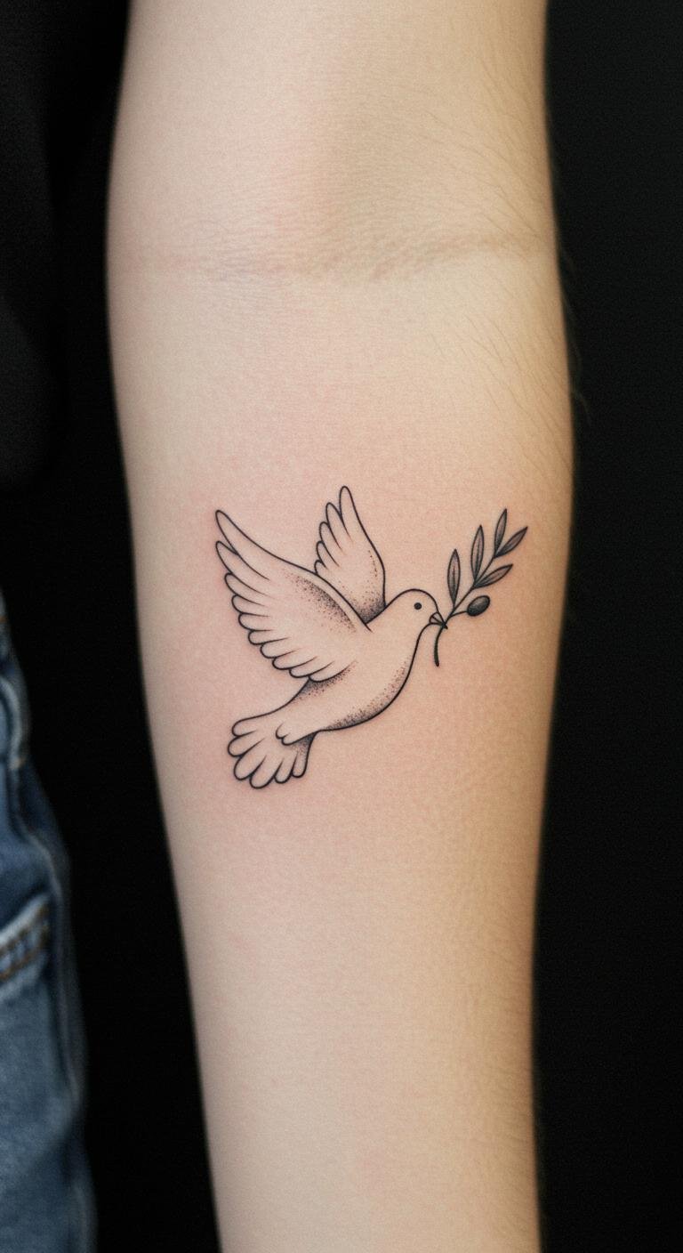 This tattoo represents profound concepts, with the dove symbolizing the Holy Spirit and divine love, while the olive branch signifies reconciliation, freedom, and new beginnings.