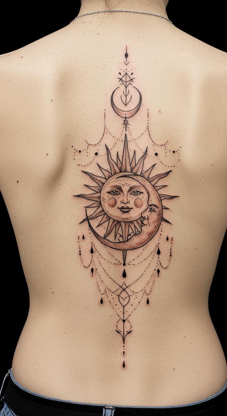 Positioned along the spine, the tattoo captures attention and serves as a personal reminder of the balance between light and dark, day and night, reflecting the wearer’s unique journey through life.
