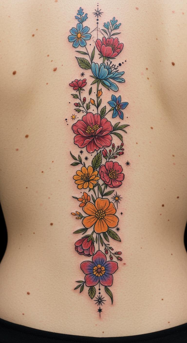 Cosmic Floral Spine Tattoo