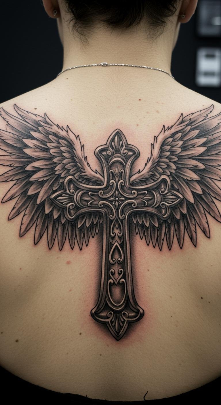 The ornate cross signifies unwavering belief, while the wings evoke feelings of upliftment and guidance throughout one’s spiritual journey.