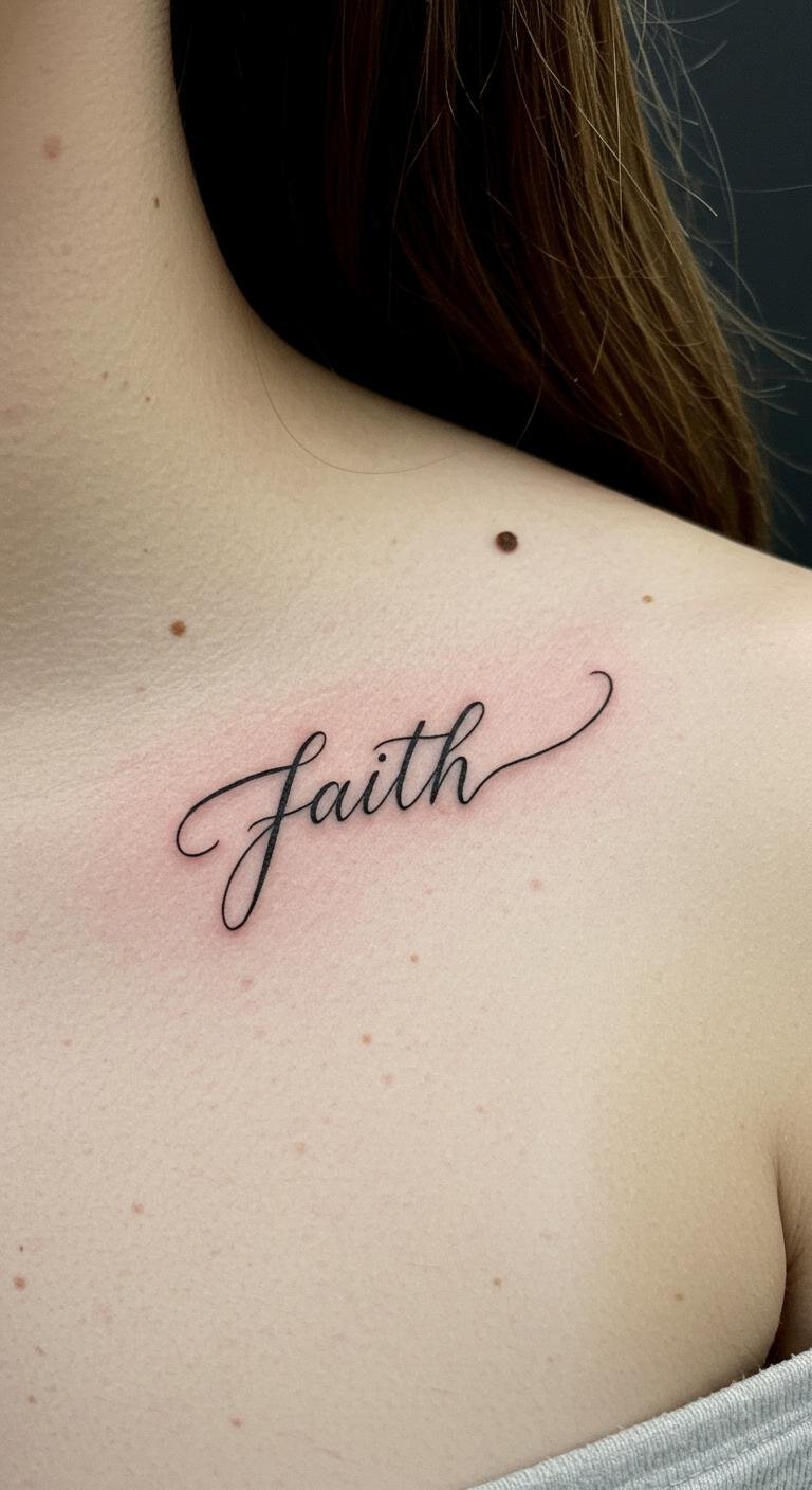 This cursive faith tattoo on the collarbone symbolizes a deep personal commitment to one’s beliefs, serving as a constant reminder of faith.