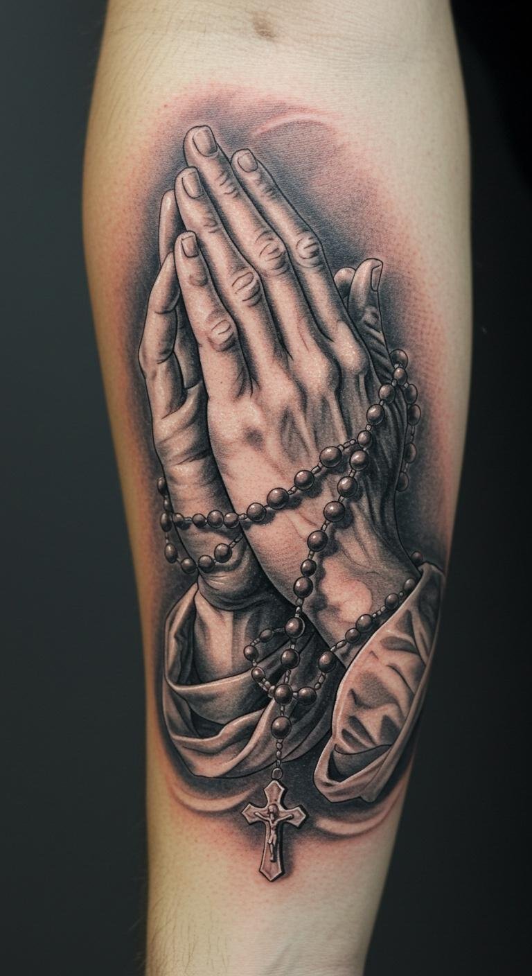 This tattoo design symbolizes a profound connection to faith, where the praying hands represent devotion and the rosary signifies spiritual guidance.