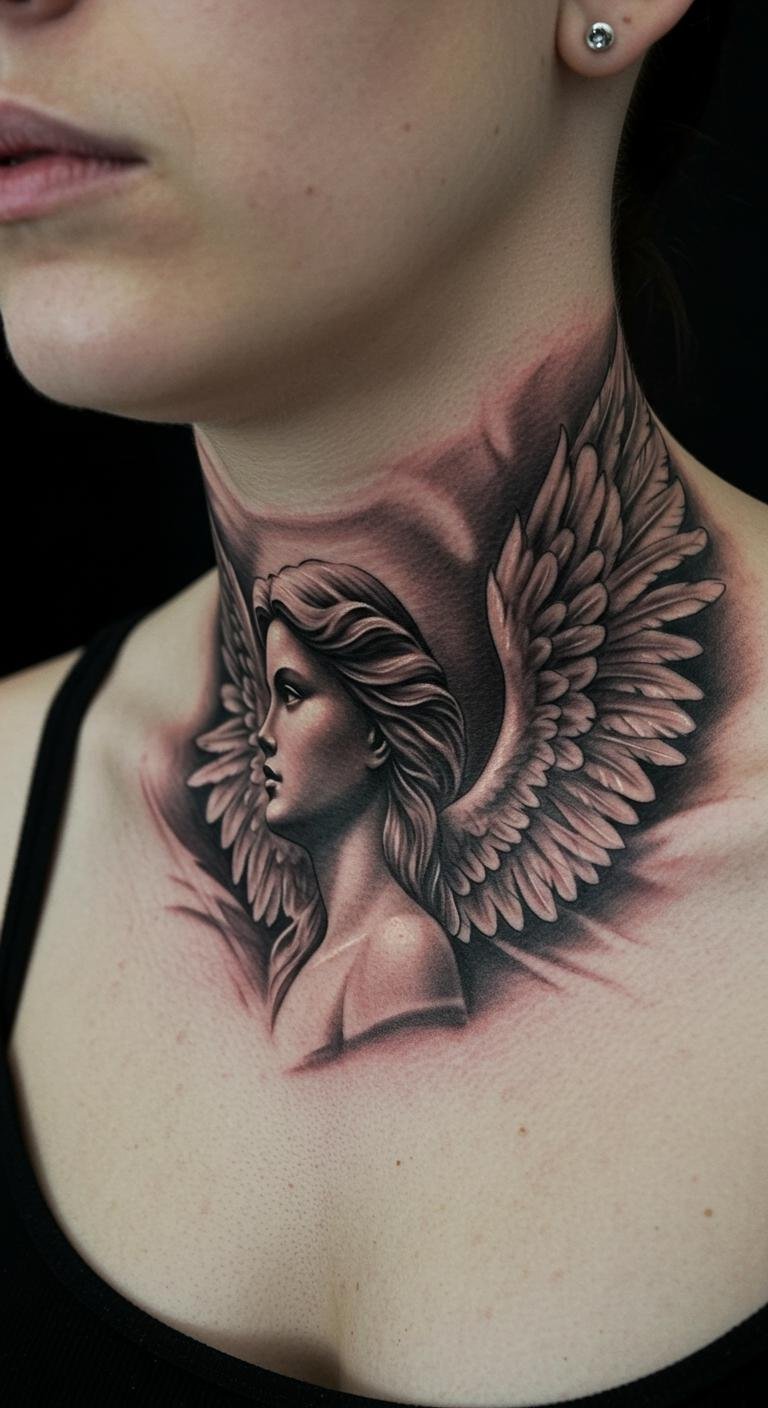 This angel profile tattoo on the collarbone symbolizes protection and divine guidance, serving as a constant reminder of faith and spiritual support.