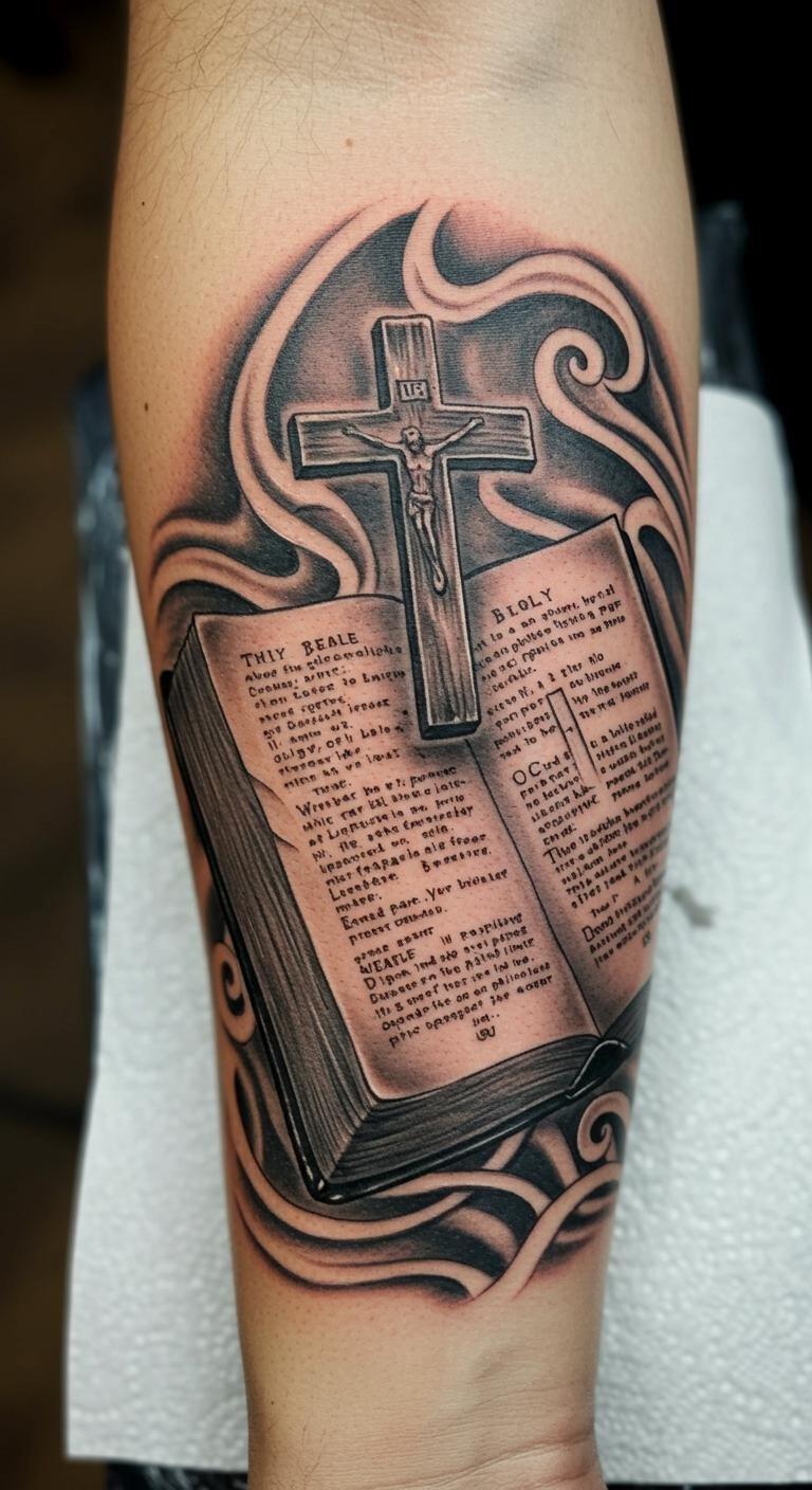 This tattoo symbolizes a deep commitment to faith and the teachings of scripture, embodying strength and openness to spiritual guidance.